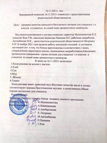 Акт бракеражной комиссии 16.11.2021 г совместно с представителями родительской общественности